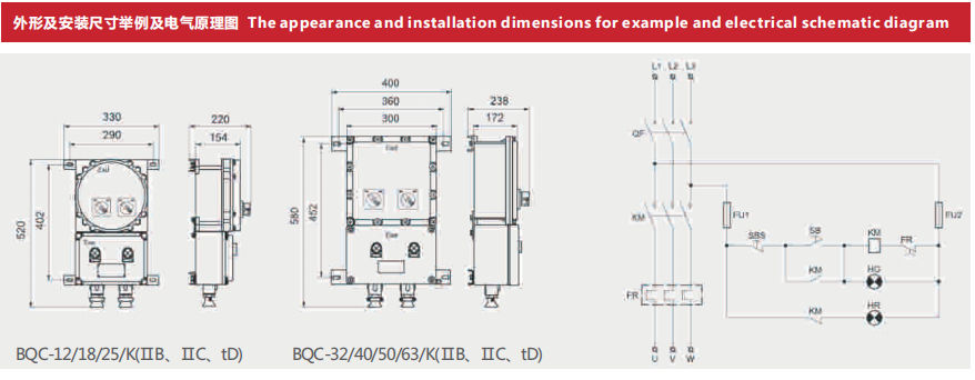 ●內(nèi)裝交流接觸器,熱繼電器,自復(fù)位萬能轉(zhuǎn)換開關(guān),帶總開關(guān)時還裝有高分斷小型斷路器;