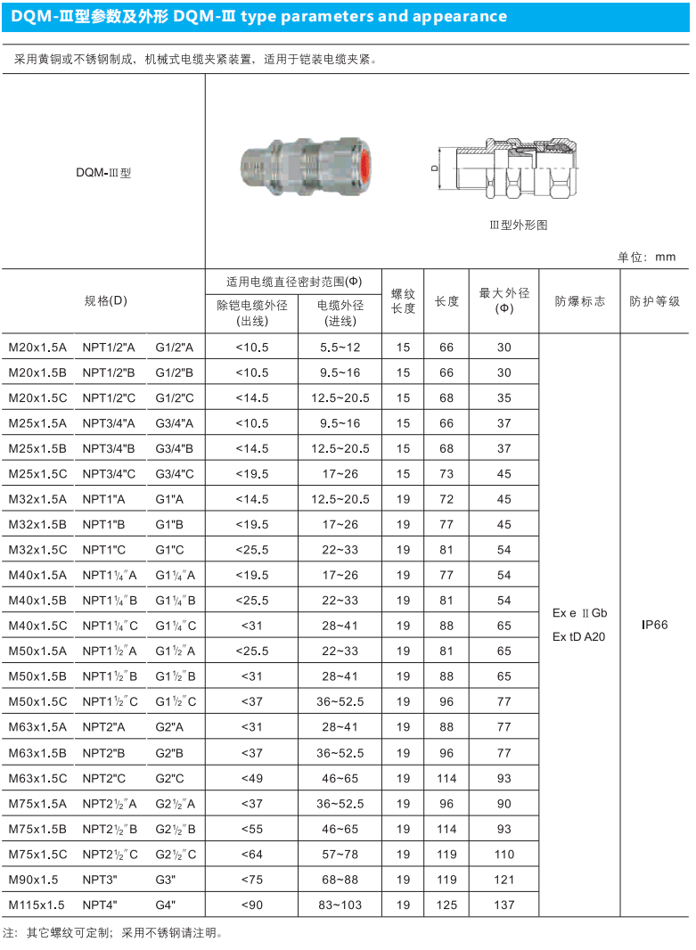 ●I、II型適用于非鎧裝電纜,III型適用于鎧裝電纜